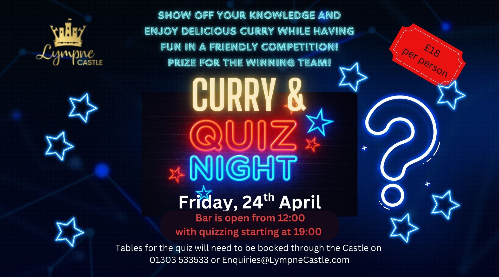 Join us for a spectacular Curry & Quiz Night at the enchanting Lympne Castle! Enjoy a delicious curry in a grand historic setting while testing your knowledge in a thrilling quiz. Gather your team, soak in the castle’s unique atmosphere, and compete for fantastic prizes. A night of great food, fun, and friendly competition awaits—don’t miss out! Book your spot now!