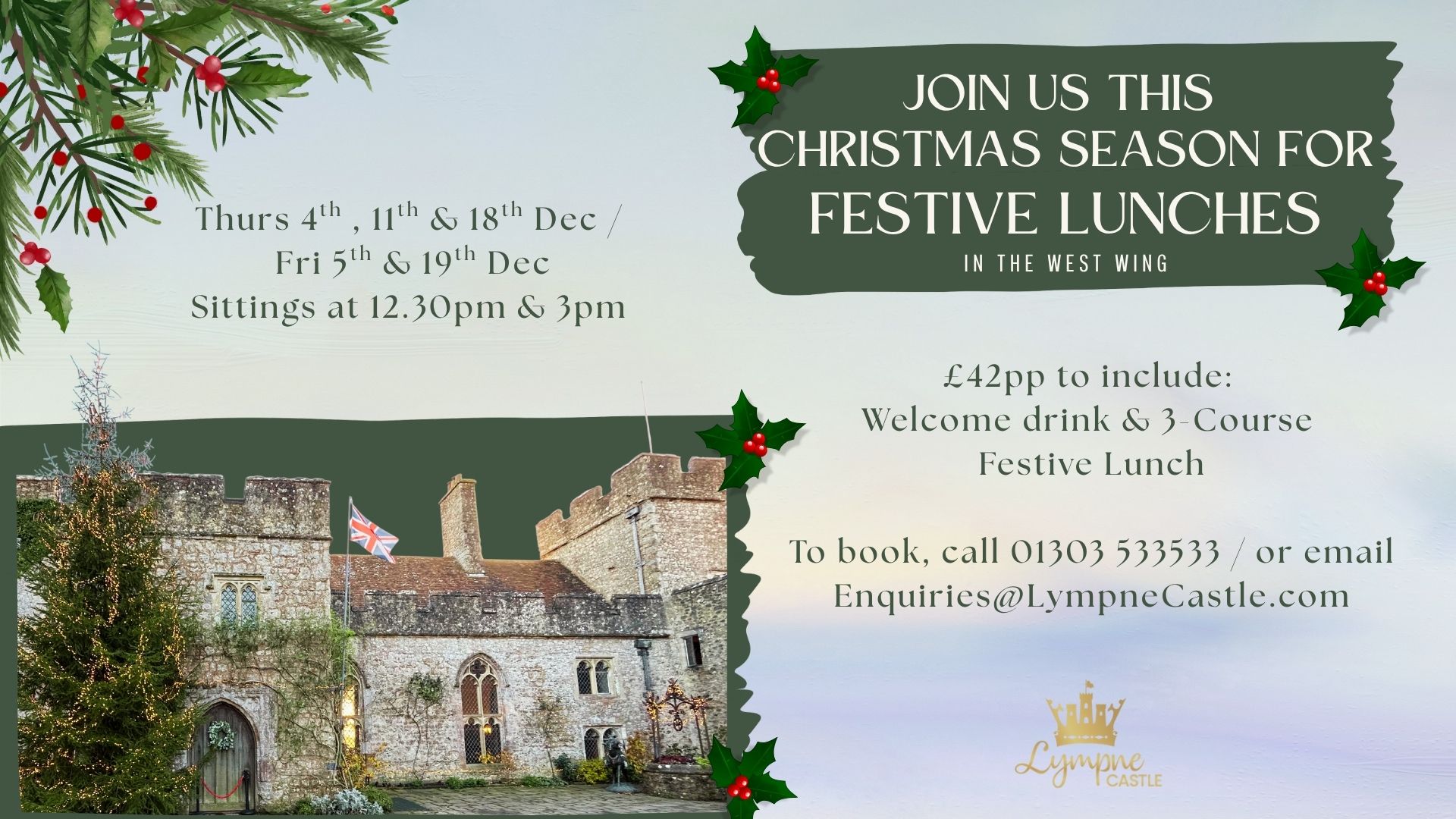 Celebrate the season with a touch of grandeur at our Festive Lunches in the West Wing! Raise a glass to the season with a complimentary drink before enjoying a delicious festive feast in the enchanting surroundings of Lympne Castle, where history meets the magic of Christmas. Whether you’re dining with family, friends, or colleagues, our castle’s cosy atmosphere and stunning views provide the perfect backdrop for a memorable festive gathering.