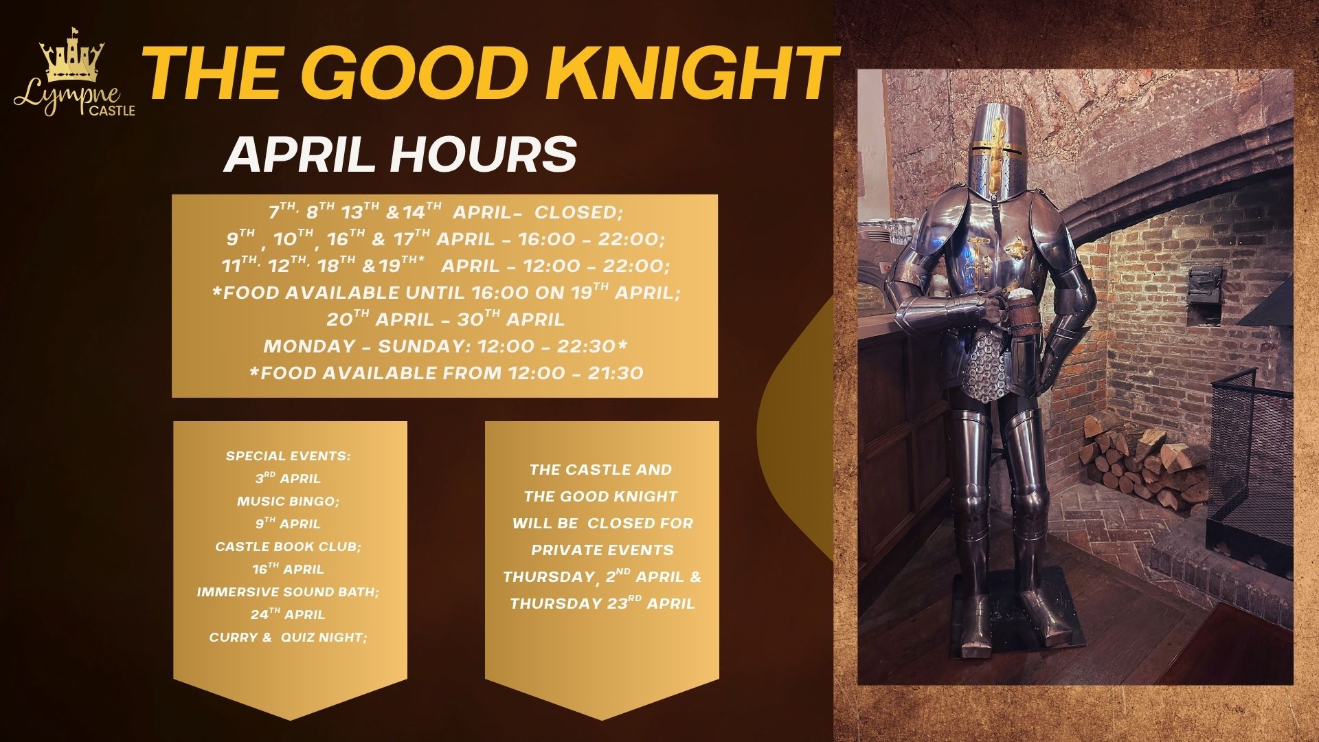 *Food available until 16:00 on 19th April, and one hour prior to closing on the other days